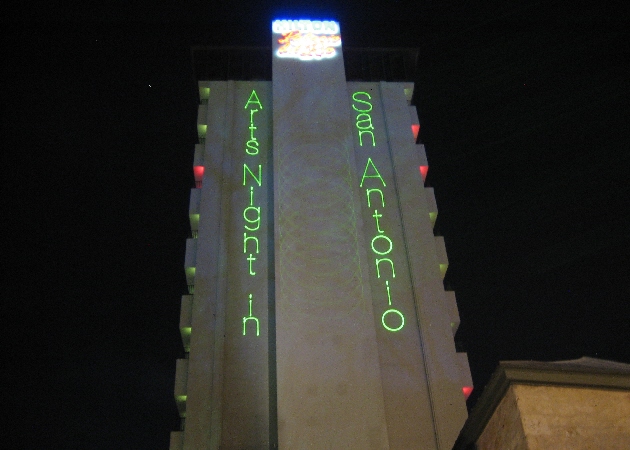 Laser Spectacles was front and center in downtown San Antonio on March 14, 2009 for the big Luminaria festival. We had a green laser projecting graphics up onto the big white Hilton “Palacio del Rio” hotel. We had another green laser projecting all the way down Alamo Stree from the “Torch” sculpture to the fire station.