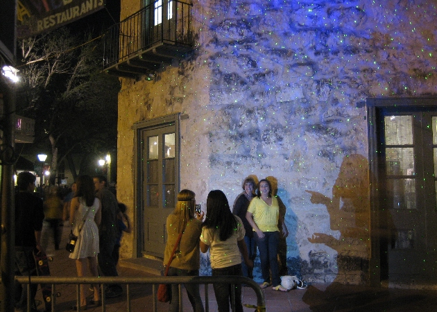 From our laser control station at the entrance to La Villita, we placed a Blisslights laser star field projector projecting a green star field on to the Little Rhein Steakhouse; the location turned out to be quite a popular photo spot!